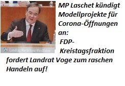 24. März 2021 < > Die nordrhein-westfälische Landesregierung will nach Ostern in ausgewählten Modellkommunen gelockerte Corona-Beschränkungen gekoppelt an ein IT-gestütztes Testkonzept einführen. Die zeitlich befristeten Modellprojekte sollen in fünf bis sechs Städten und Landkreisen umgesetzt werden, sagte Ministerpräsident Armin Laschet (CDU) heute im Düsseldorfer Landtag. Darunter sollen Orte in Westfalen und im Rheinland, große und kleine Städte sowie Landkreise sein.